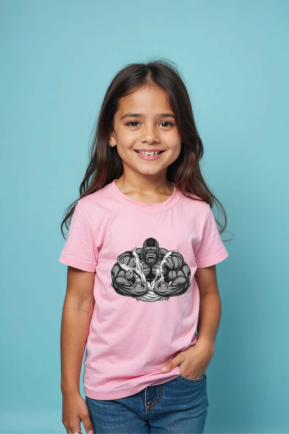 Muscular Gorilla Graphic Pink T-Shirt – Bold Power Cartoon Kids Tee
