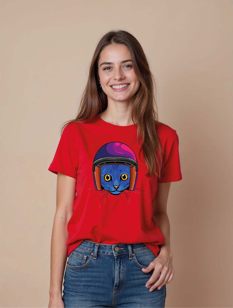 Blue Cat Face Wearing Purple and Red Motorcycle Helmet Stylish Women’s T-Shirt
