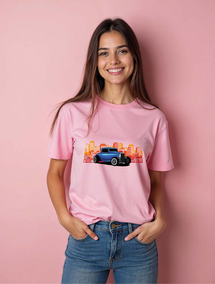 Blue Hot Rod with Urban Sunset Skyline Casual Women’s Printed Graphic T-Shirt