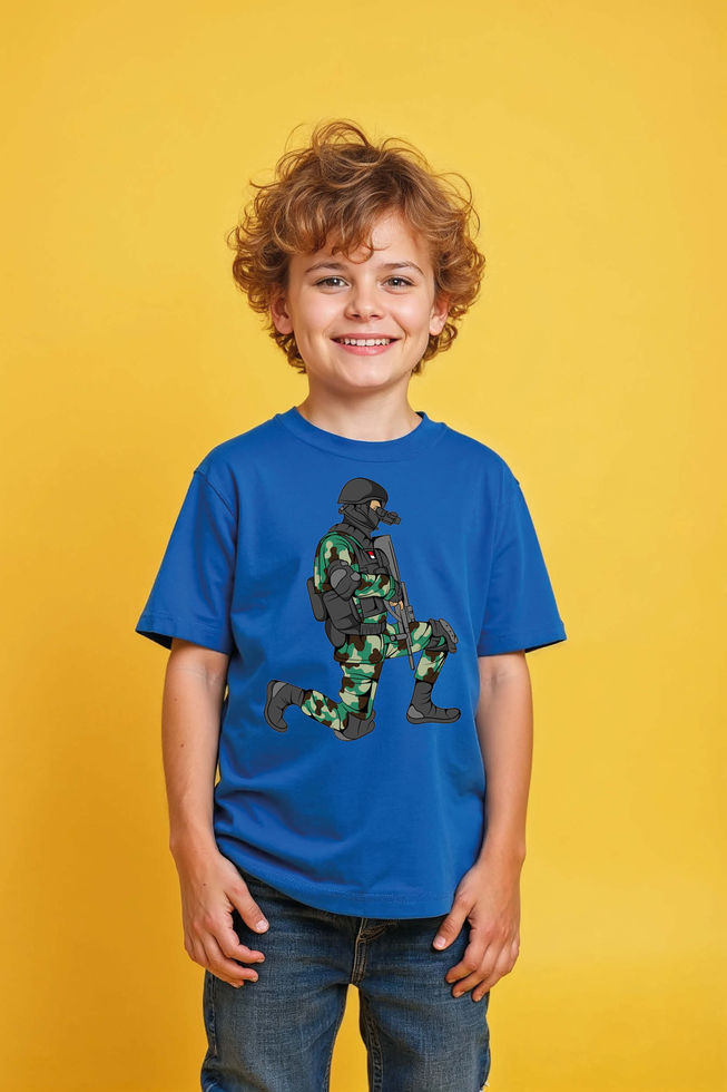Camouflage Soldier Kneeling Playful Kids Graphic Tee – Print Design