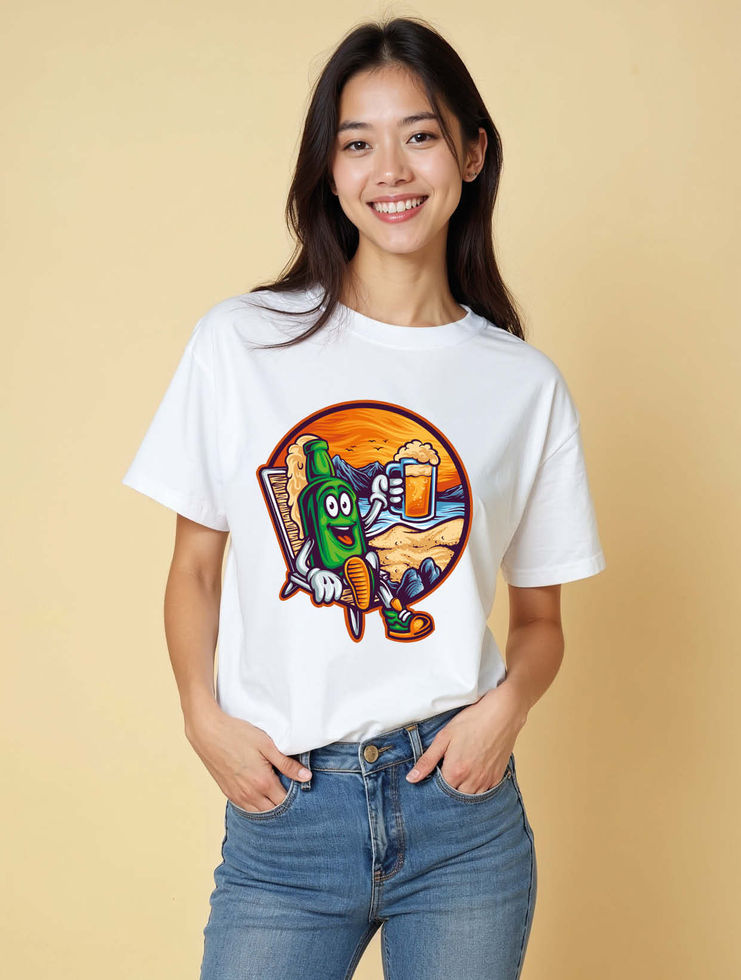 Cartoon Beer Bottle Relaxing on Beach Unisex Drop Shoulder Oversized T-Shirt