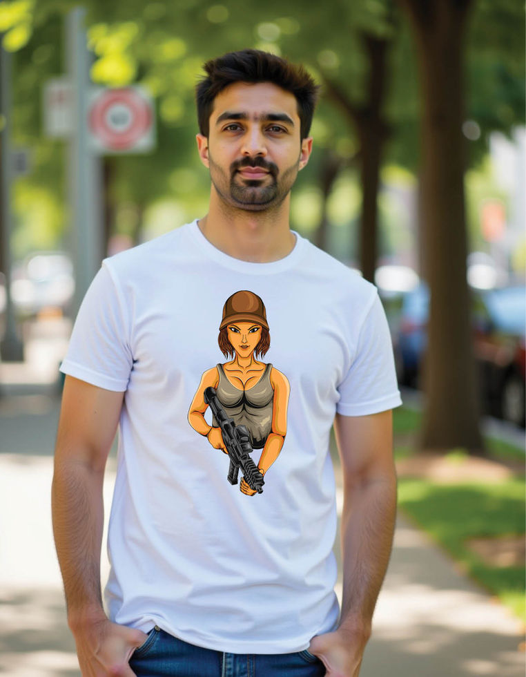 cartoon girl warrior with weapon mens printed graphic t shirt