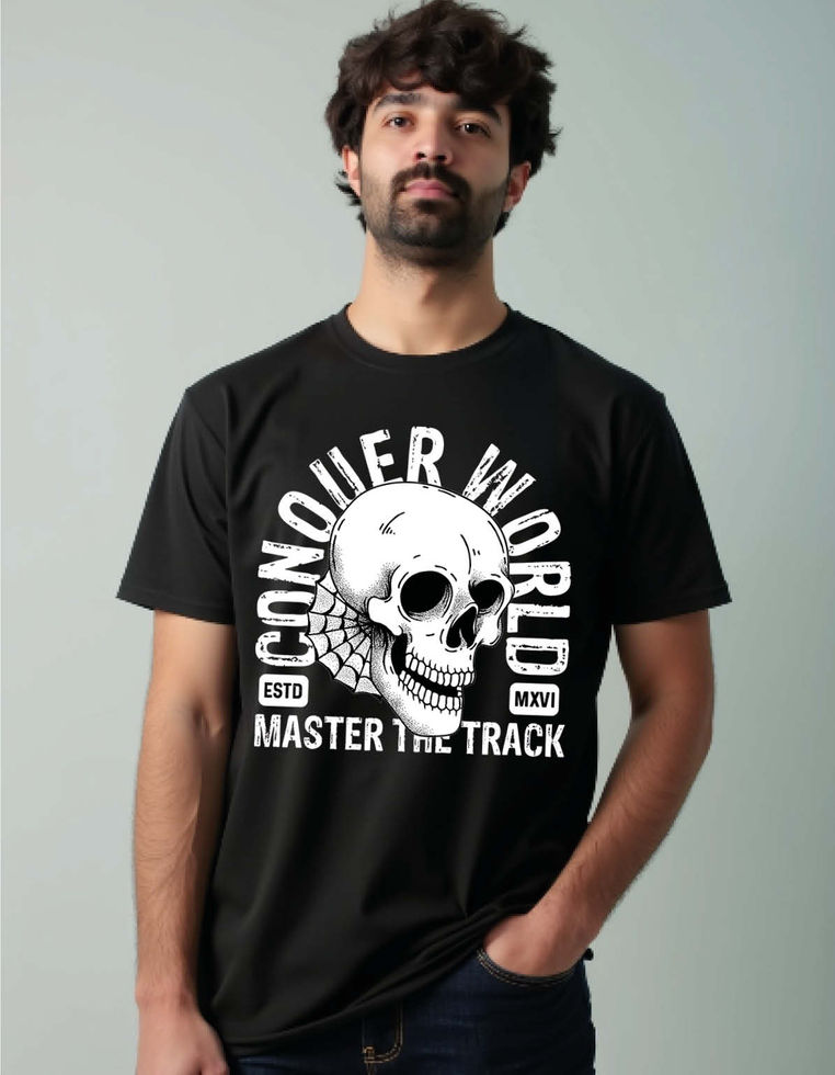 conouer world master the track printed T-Shirt for all ages