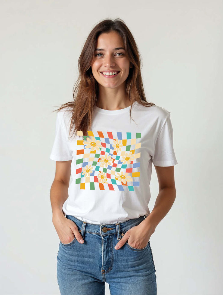Groovy Daisy Checkerboard Casual Women’s Printed Graphic Streetwear T-Shirt