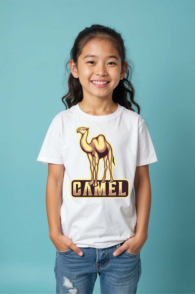 Kids' T-Shirt with Stylized Camel Graphic and "CAMEL" Modern Typography Print