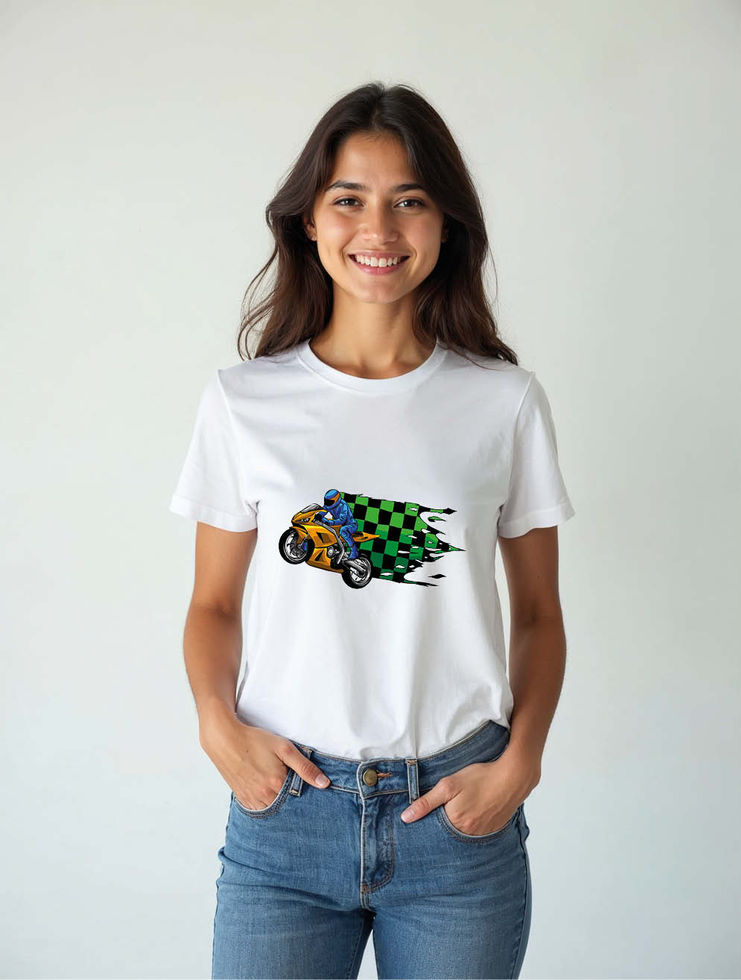 Motorcycle Racer with Green Checkered Speed Flag Stylish Women’s Printed T-Shirt