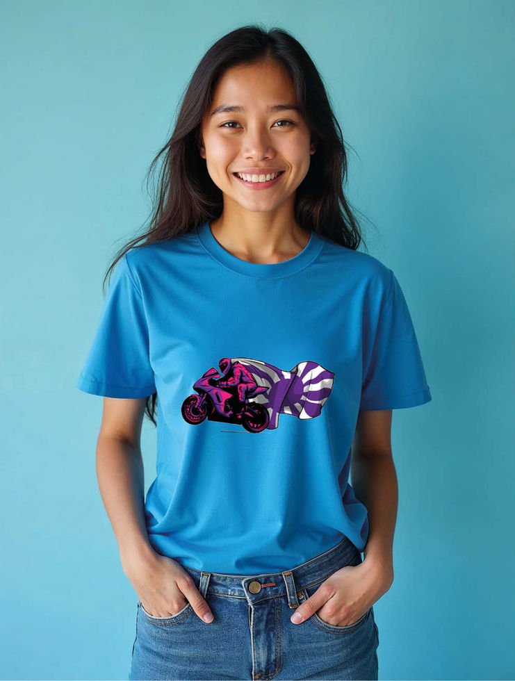 Motorcycle Racer with Purple and White Checkered Speed Flag Trendy Women’s Tees