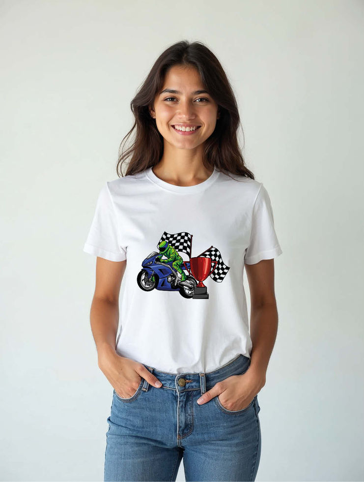 Motorcycle Racer with Trophy and Checkered Flag Classic Women’s Printed T-Shirt