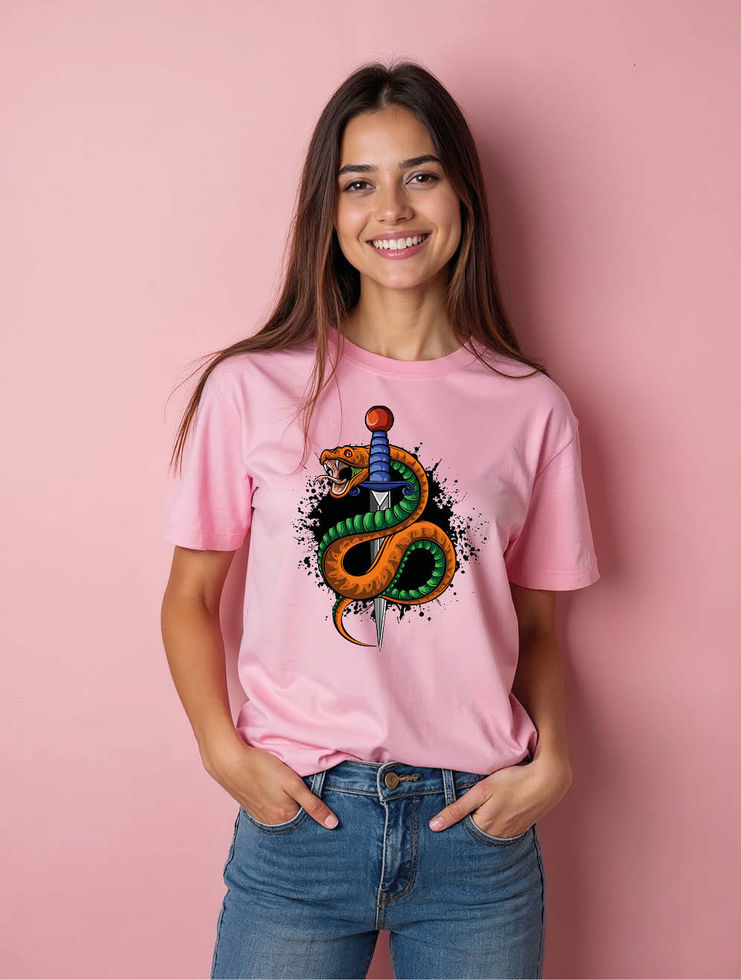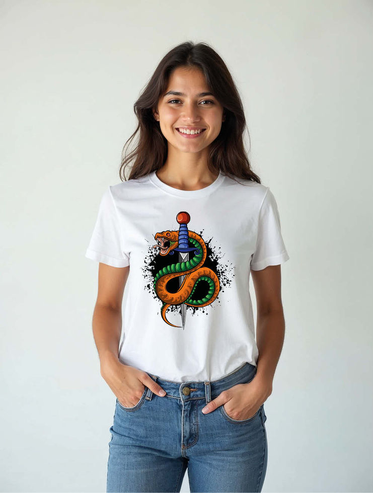 Orange and Green Snake Coiled Around a Dagger Casual Women’s Printed T-Shirt