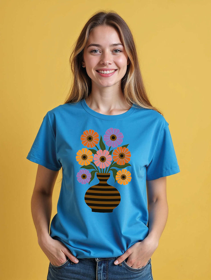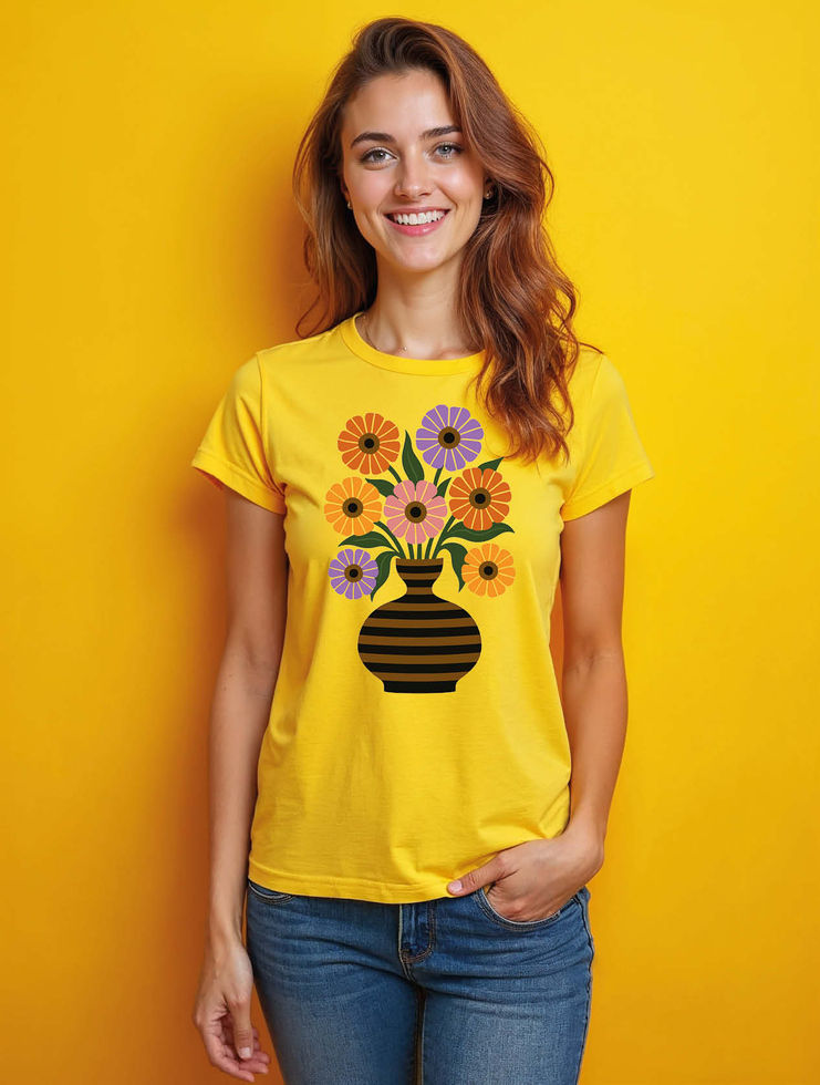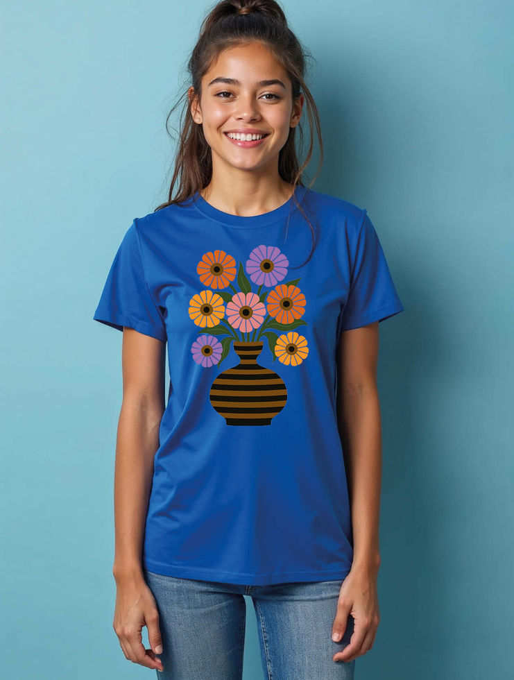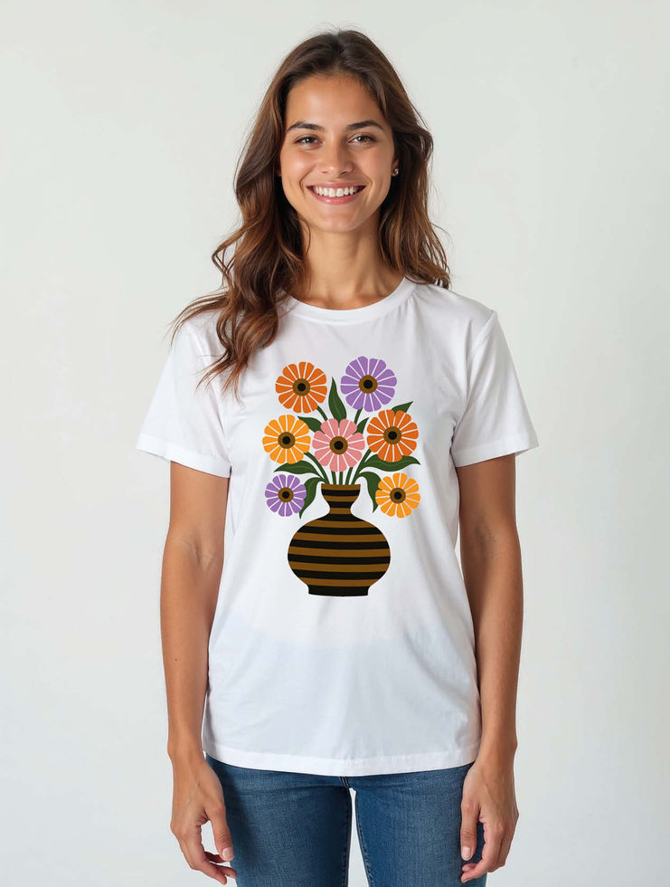 Retro Flower Bouquet in Striped Vase Classic Women’s Printed Graphic T-Shirt