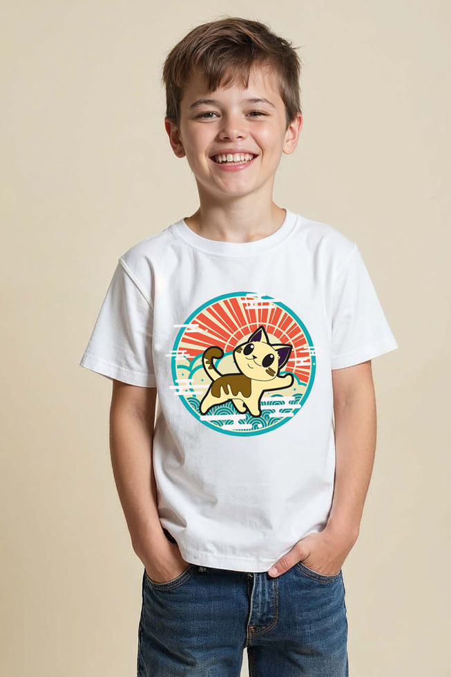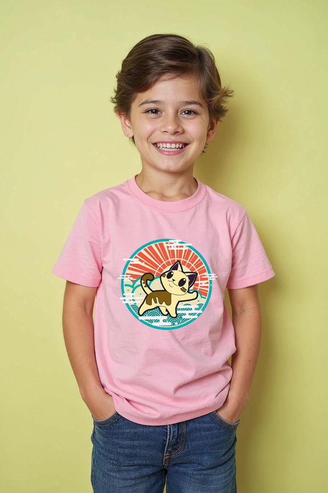 Waving Kawaii Cat and Rising Sun Kid's T-Shirt Soft Stylish Kids Graphic T-Shirt