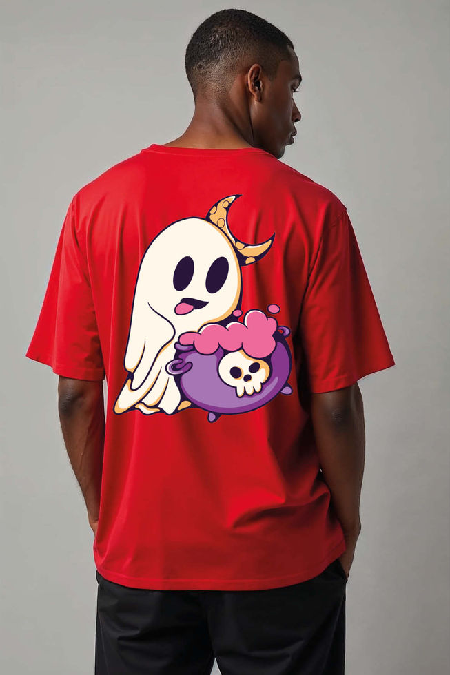 Witchy Ghost with Cauldron Trendy Graphic Unisex Drop Shoulder Oversized T-Shirt